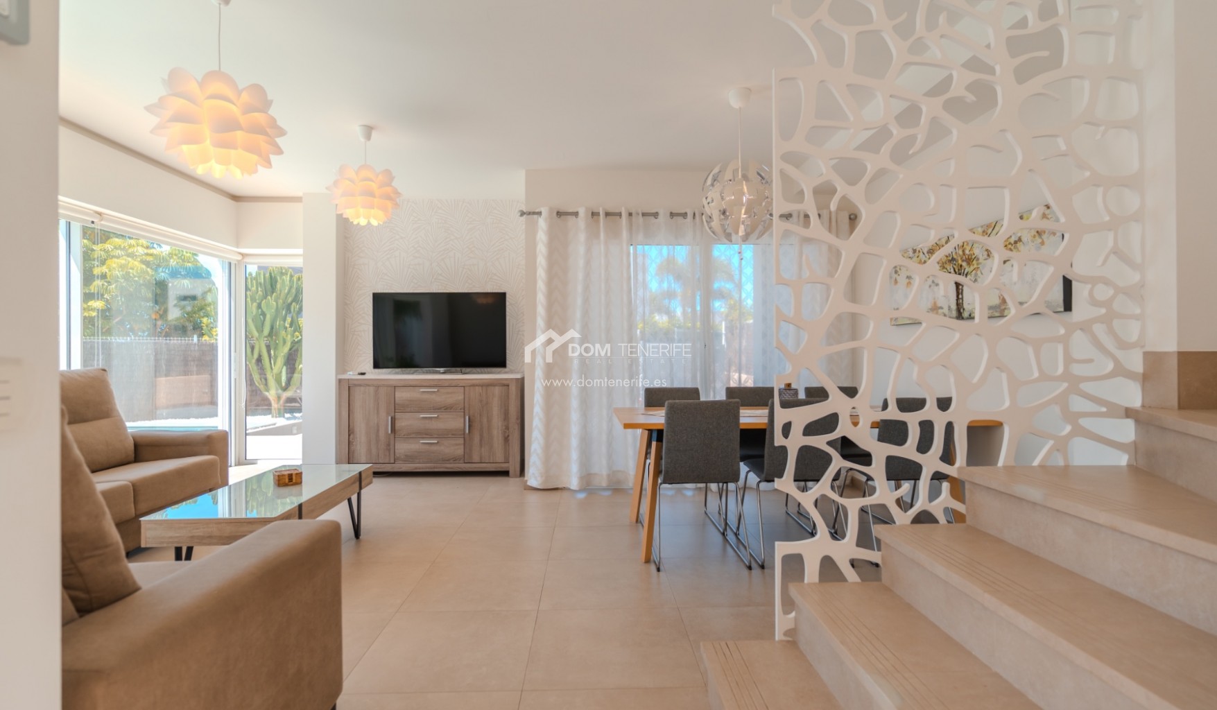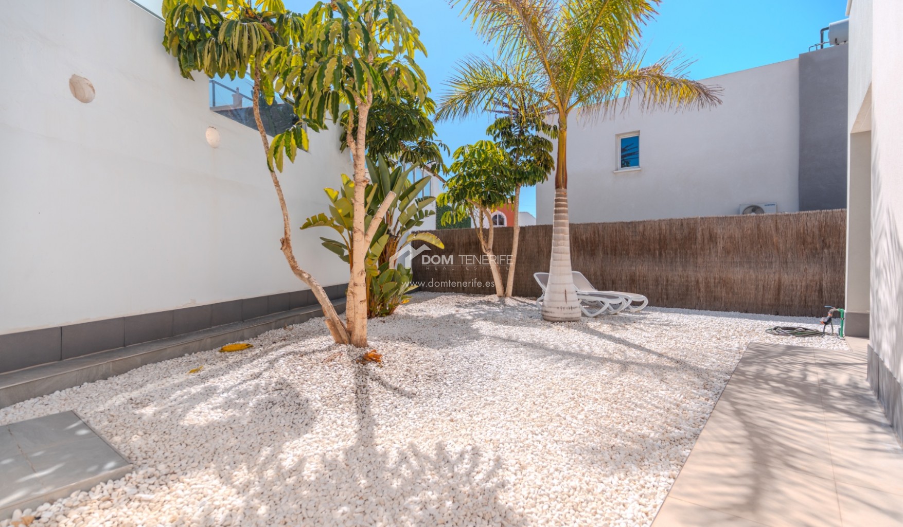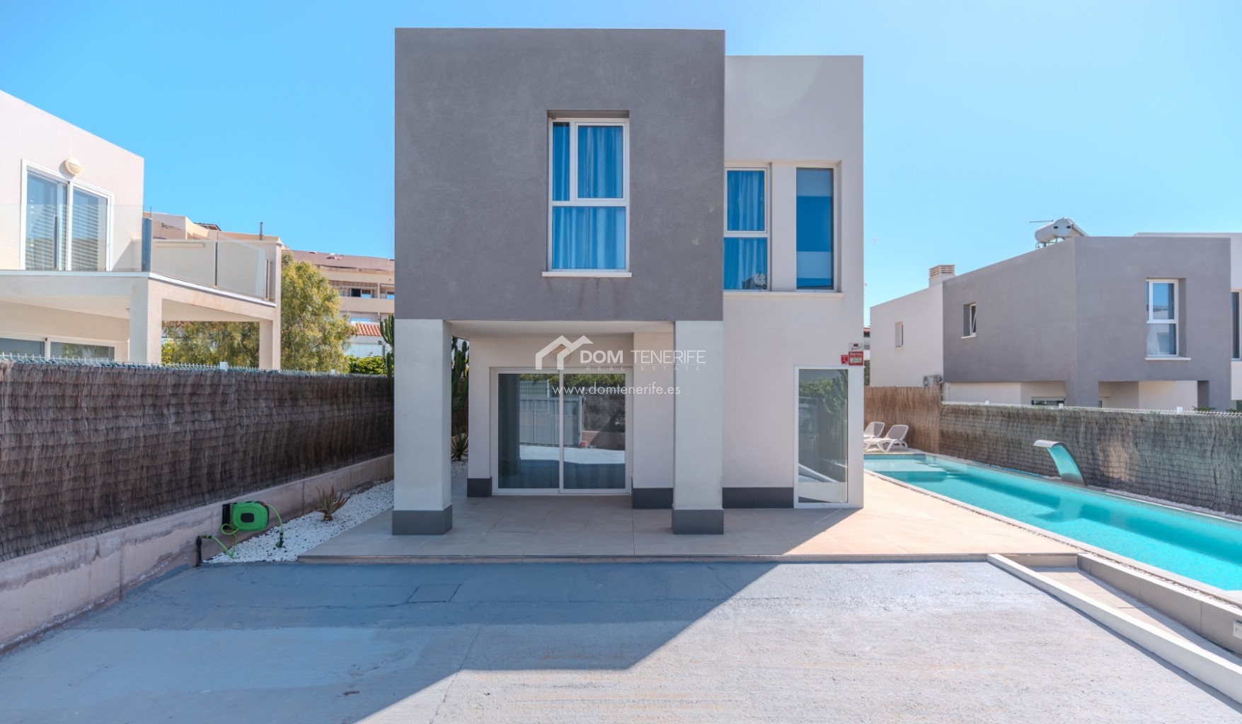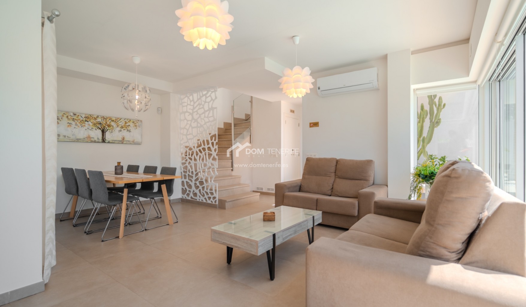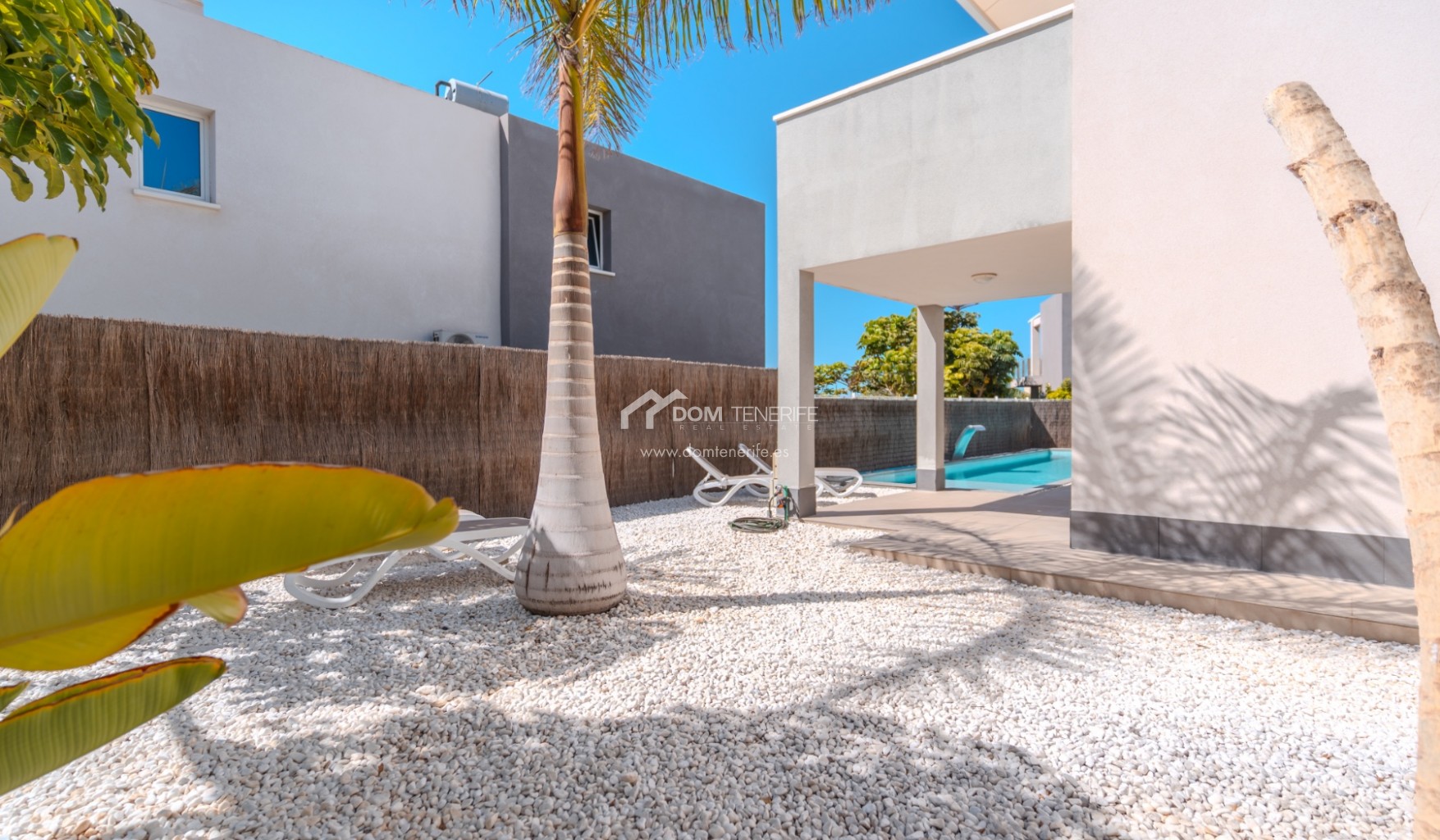 Moderne und helle Villa zum Verkauf in der privaten Wohnanlage „Nirvana Paraíso” in Playa Paraíso, erbaut auf einem Grundstück von 386,85 m² mit einer Gesamtfläche von 146,85 m² (104,22 m² nutzbar). Diese Immobilie erstreckt sich über zwei Etagen und bietet eine hervorragende Kombination aus Komfort, zeitgemäßem Design und einer privilegierten Lage im Süden Teneriffas. Im Erdgeschoss befinden sich ein geräumiges Wohn-Esszimmer, eine voll ausgestattete Küche, eine Toilette und ein Abstellraum. Im Obergeschoss befinden sich drei Schlafzimmer mit Einbauschränken, zwei Badezimmer (eines davon en suite) und zusätzlicher Stauraum. Das Hauptschlafzimmer hat Zugang zu einer privaten Terrasse mit kleinem Meerblick. Die Villa verfügt über eine Klimaanlage im gesamten Haus und Sonnenkollektoren für Warmwasser. Im Außenbereich umgeben große Terrassen den beheizten Pool und den Garten. Auf der Rückseite befindet sich ein Abstell-/Hauswirtschaftsraum, und auf der Vorderseite gibt es Platz zum Parken von mindestens zwei Fahrzeugen. Die Immobilie liegt gegenüber dem Einkaufszentrum Las Rosas, nur wenige Gehminuten von Geschäften, Restaurants und Bars entfernt und nur 10 Gehminuten vom Strand Las Galgas und dem Hard Rock Hotel Tenerife. Die Immobilie wird mit einer Ferienlizenz verkauft und ist somit eine ausgezeichnete Wahl sowohl als Hauptwohnsitz als auch als rentable Investition in einer der begehrtesten Gegenden im Süden Teneriffas. Gemeinschaftsgebühren: 41,43 €/Monat | Grundsteuer: 527,64 €/Jahr | Müllabfuhrgebühr: 34,25 €/Halbjahr. DOM Tenerife – kaufen Sie sicher!
