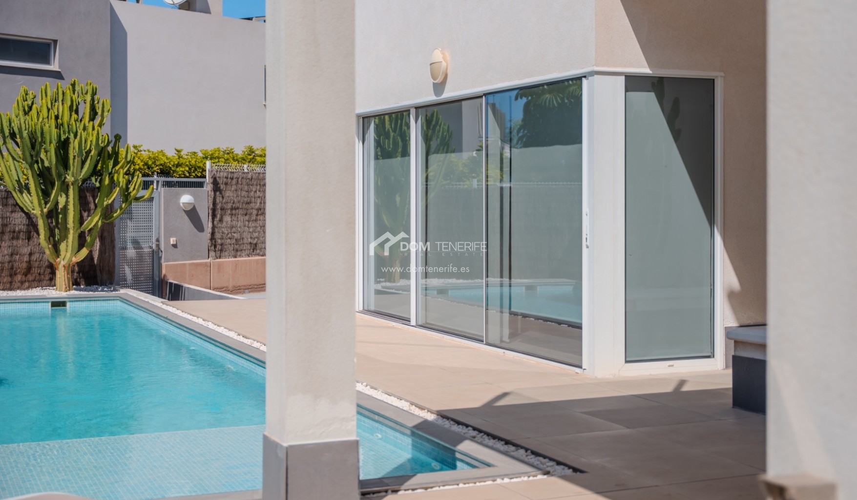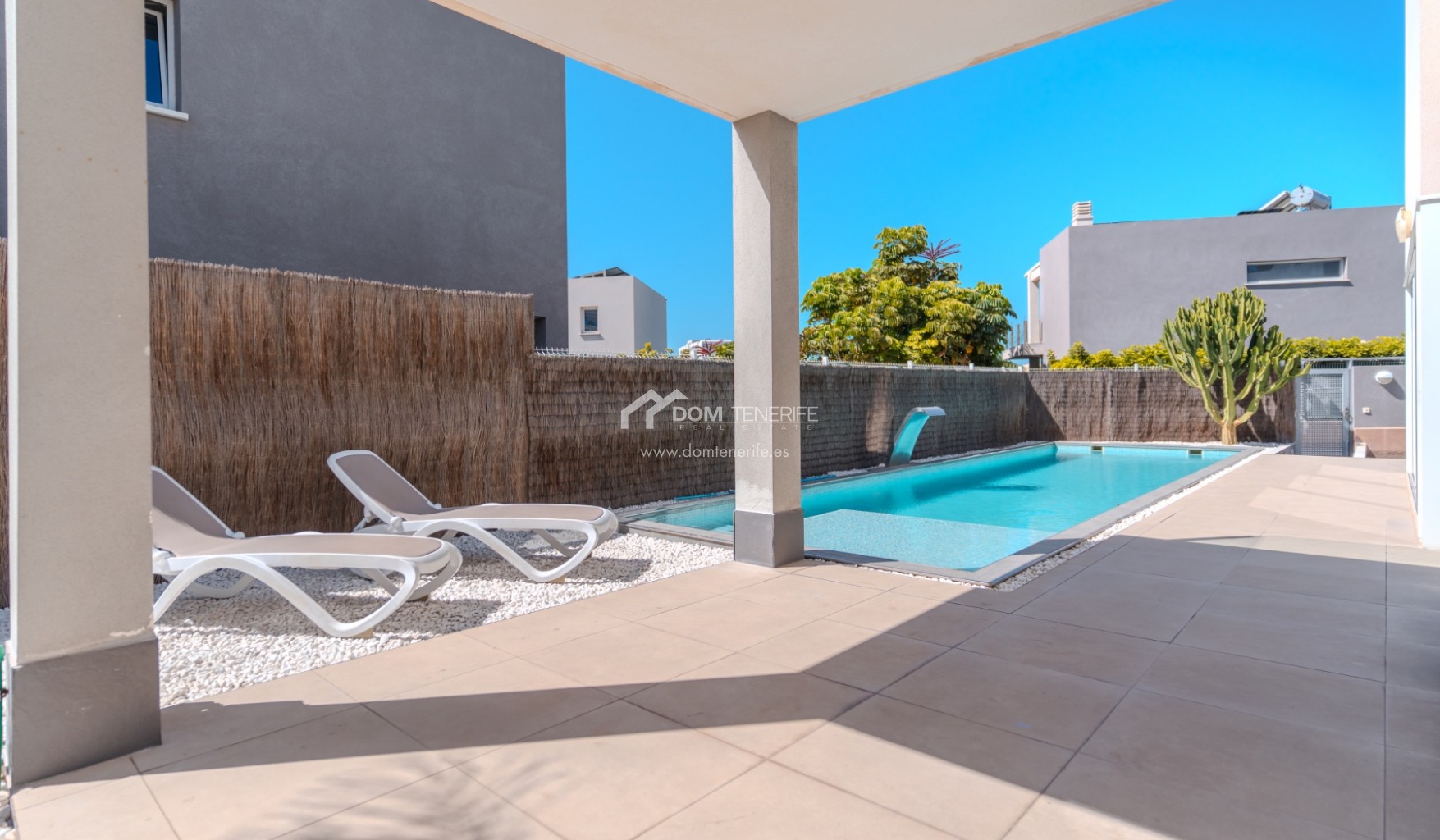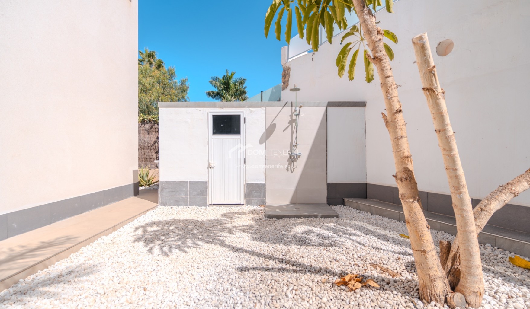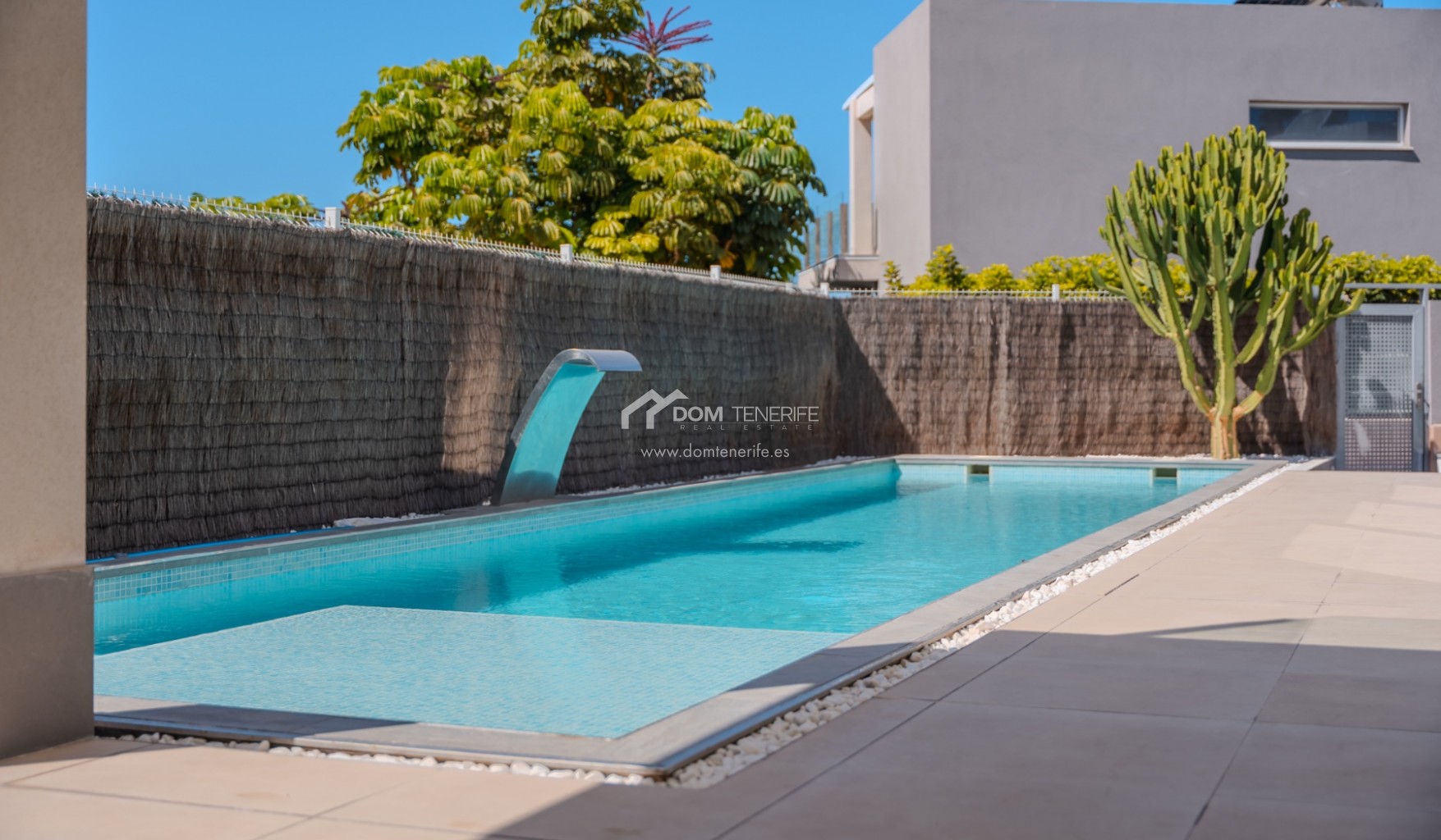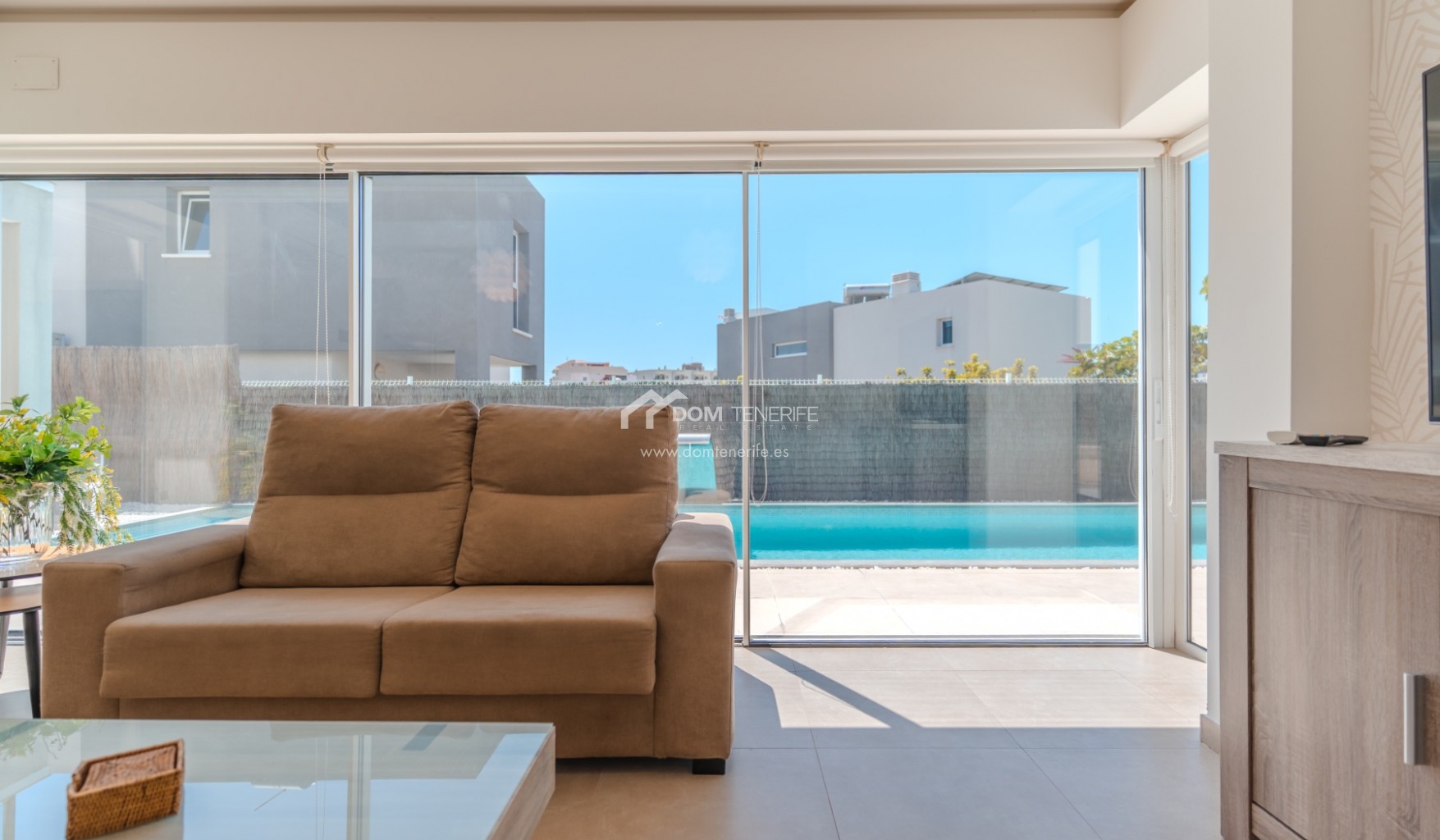 Moderne und helle Villa zum Verkauf in der privaten Wohnanlage „Nirvana Paraíso” in Playa Paraíso, erbaut auf einem Grundstück von 386,85 m² mit einer Gesamtfläche von 146,85 m² (104,22 m² nutzbar). Diese Immobilie erstreckt sich über zwei Etagen und bietet eine hervorragende Kombination aus Komfort, zeitgemäßem Design und einer privilegierten Lage im Süden Teneriffas. Im Erdgeschoss befinden sich ein geräumiges Wohn-Esszimmer, eine voll ausgestattete Küche, eine Toilette und ein Abstellraum. Im Obergeschoss befinden sich drei Schlafzimmer mit Einbauschränken, zwei Badezimmer (eines davon en suite) und zusätzlicher Stauraum. Das Hauptschlafzimmer hat Zugang zu einer privaten Terrasse mit kleinem Meerblick. Die Villa verfügt über eine Klimaanlage im gesamten Haus und Sonnenkollektoren für Warmwasser. Im Außenbereich umgeben große Terrassen den beheizten Pool und den Garten. Auf der Rückseite befindet sich ein Abstell-/Hauswirtschaftsraum, und auf der Vorderseite gibt es Platz zum Parken von mindestens zwei Fahrzeugen. Die Immobilie liegt gegenüber dem Einkaufszentrum Las Rosas, nur wenige Gehminuten von Geschäften, Restaurants und Bars entfernt und nur 10 Gehminuten vom Strand Las Galgas und dem Hard Rock Hotel Tenerife. Die Immobilie wird mit einer Ferienlizenz verkauft und ist somit eine ausgezeichnete Wahl sowohl als Hauptwohnsitz als auch als rentable Investition in einer der begehrtesten Gegenden im Süden Teneriffas. Gemeinschaftsgebühren: 41,43 €/Monat | Grundsteuer: 527,64 €/Jahr | Müllabfuhrgebühr: 34,25 €/Halbjahr. DOM Tenerife – kaufen Sie sicher!