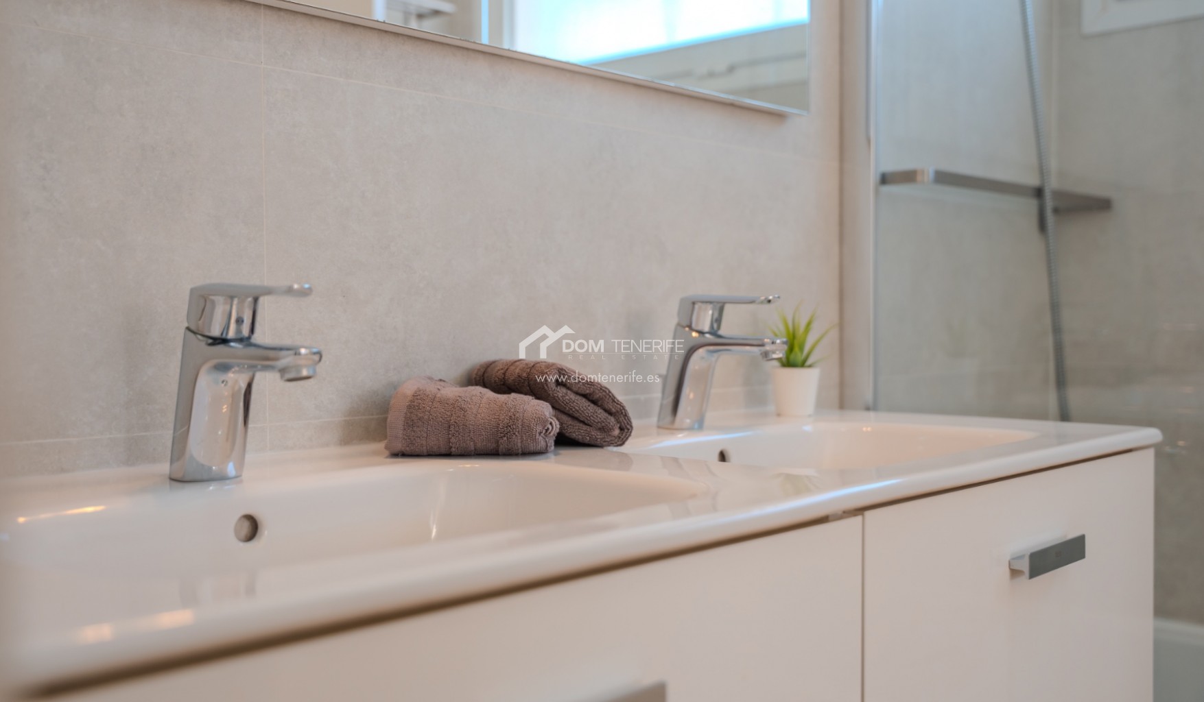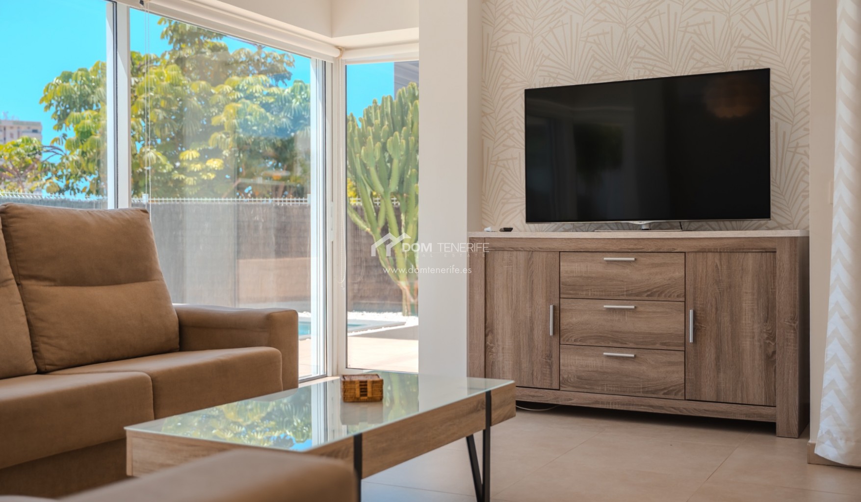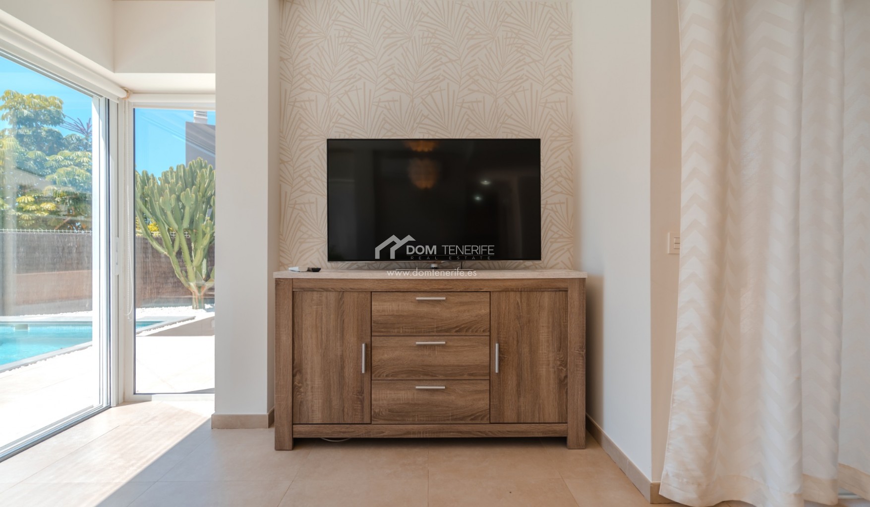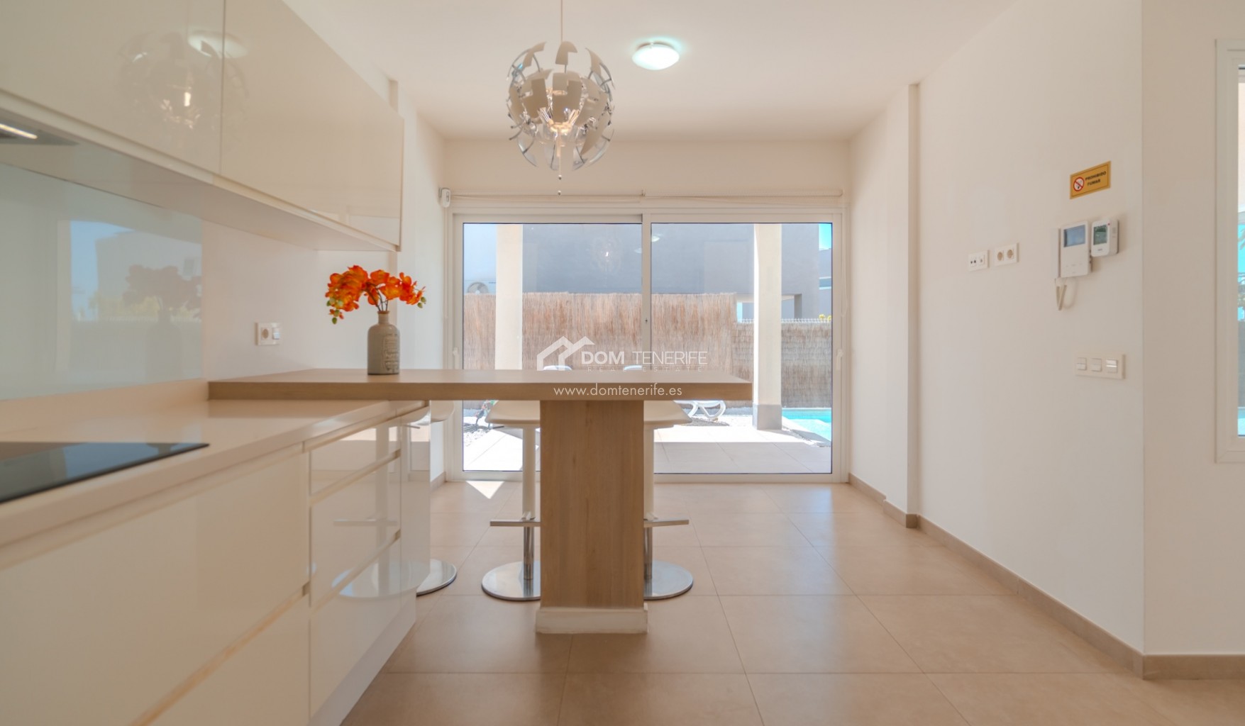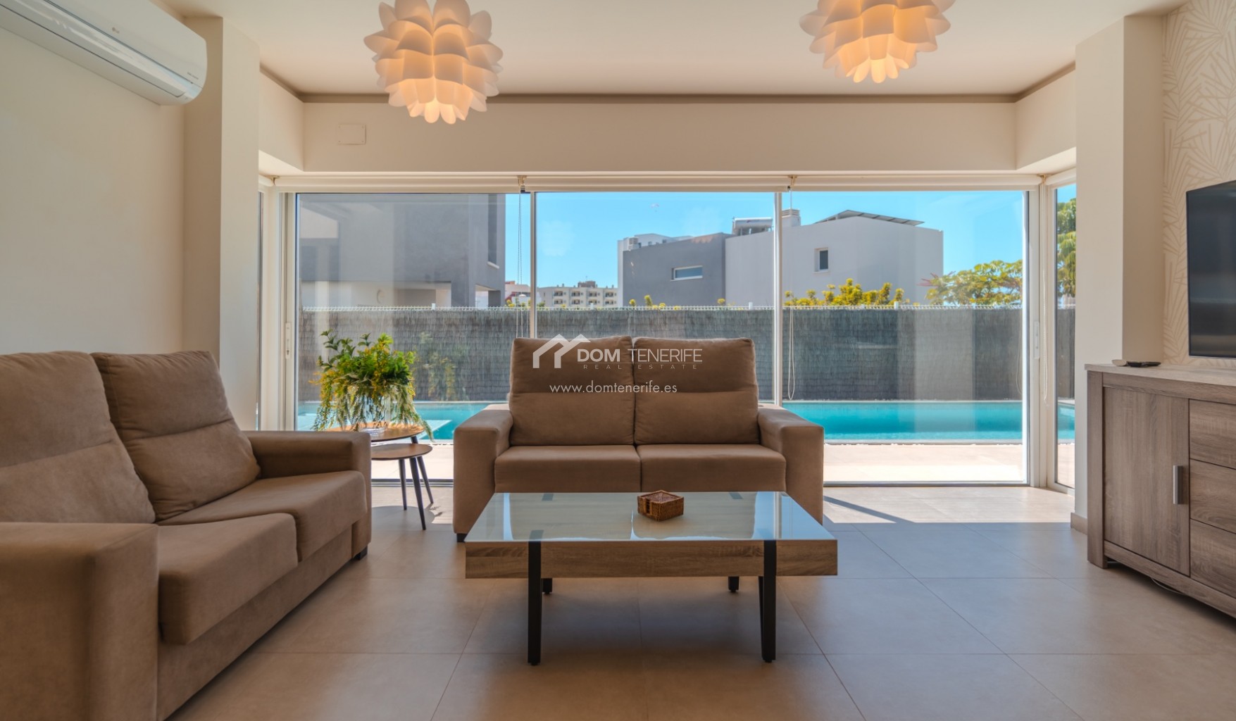 Moderne und helle Villa zum Verkauf in der privaten Wohnanlage „Nirvana Paraíso” in Playa Paraíso, erbaut auf einem Grundstück von 386,85 m² mit einer Gesamtfläche von 146,85 m² (104,22 m² nutzbar). Diese Immobilie erstreckt sich über zwei Etagen und bietet eine hervorragende Kombination aus Komfort, zeitgemäßem Design und einer privilegierten Lage im Süden Teneriffas. Im Erdgeschoss befinden sich ein geräumiges Wohn-Esszimmer, eine voll ausgestattete Küche, eine Toilette und ein Abstellraum. Im Obergeschoss befinden sich drei Schlafzimmer mit Einbauschränken, zwei Badezimmer (eines davon en suite) und zusätzlicher Stauraum. Das Hauptschlafzimmer hat Zugang zu einer privaten Terrasse mit kleinem Meerblick. Die Villa verfügt über eine Klimaanlage im gesamten Haus und Sonnenkollektoren für Warmwasser. Im Außenbereich umgeben große Terrassen den beheizten Pool und den Garten. Auf der Rückseite befindet sich ein Abstell-/Hauswirtschaftsraum, und auf der Vorderseite gibt es Platz zum Parken von mindestens zwei Fahrzeugen. Die Immobilie liegt gegenüber dem Einkaufszentrum Las Rosas, nur wenige Gehminuten von Geschäften, Restaurants und Bars entfernt und nur 10 Gehminuten vom Strand Las Galgas und dem Hard Rock Hotel Tenerife. Die Immobilie wird mit einer Ferienlizenz verkauft und ist somit eine ausgezeichnete Wahl sowohl als Hauptwohnsitz als auch als rentable Investition in einer der begehrtesten Gegenden im Süden Teneriffas. Gemeinschaftsgebühren: 41,43 €/Monat | Grundsteuer: 527,64 €/Jahr | Müllabfuhrgebühr: 34,25 €/Halbjahr. DOM Tenerife – kaufen Sie sicher!
