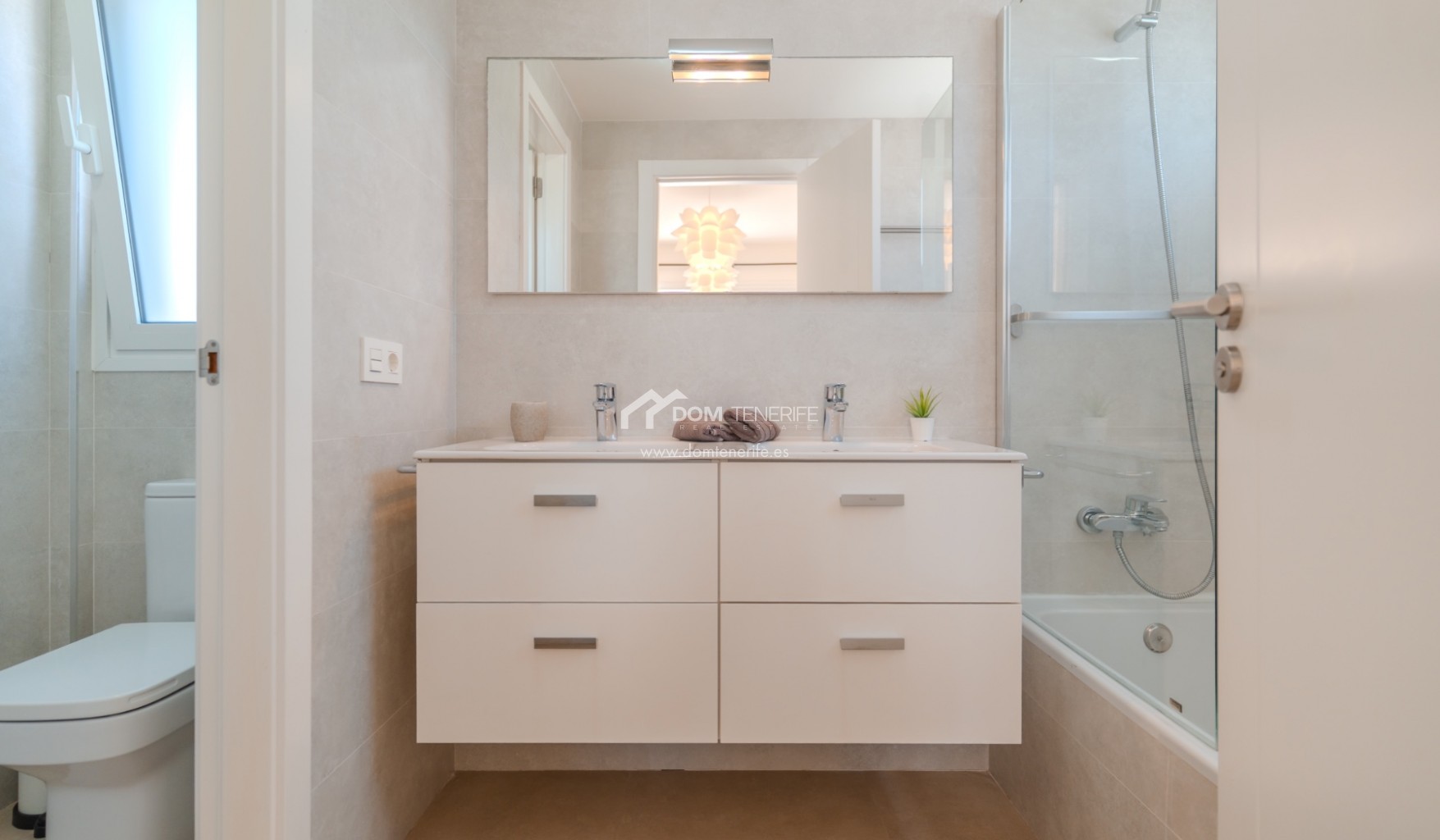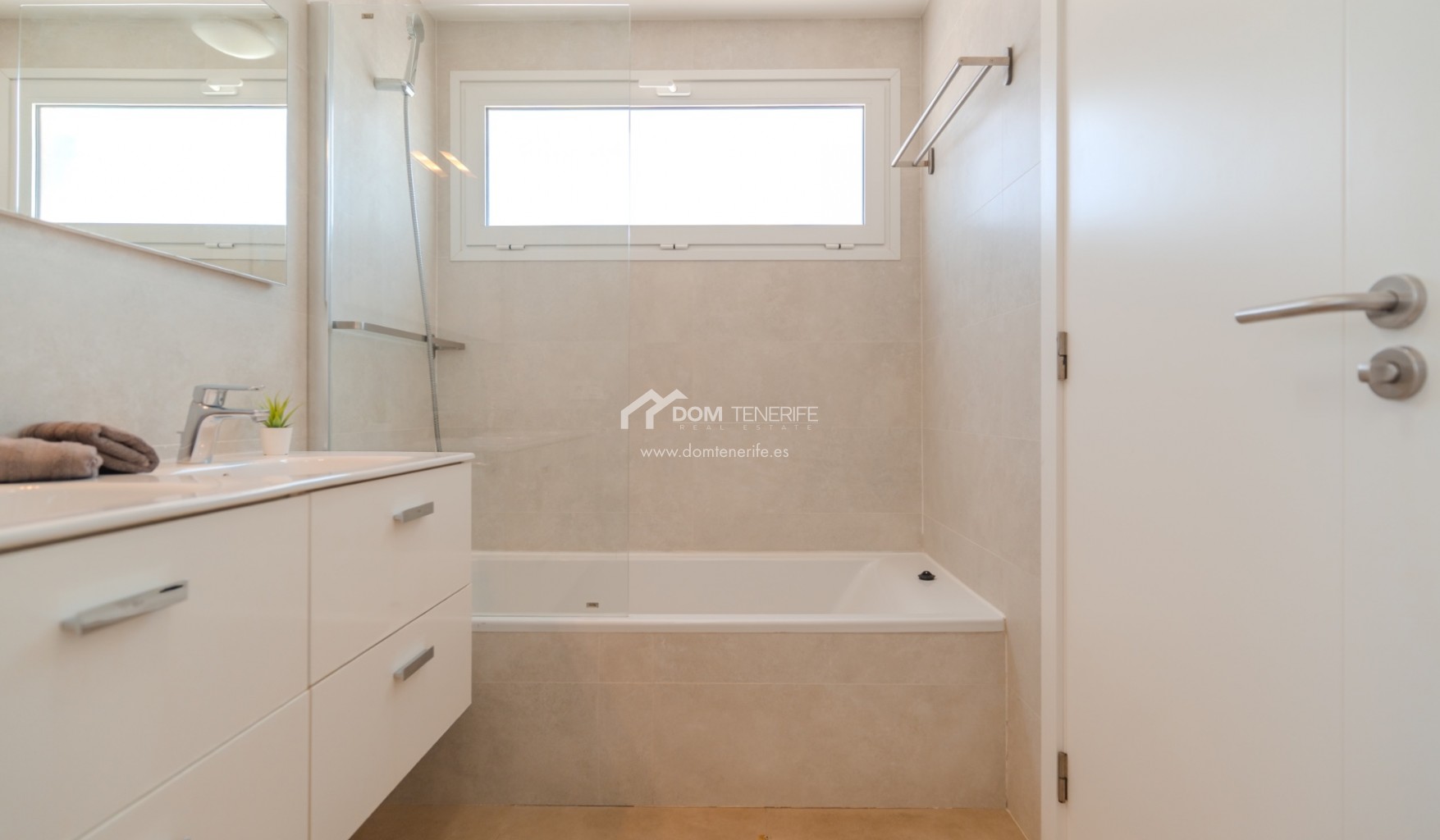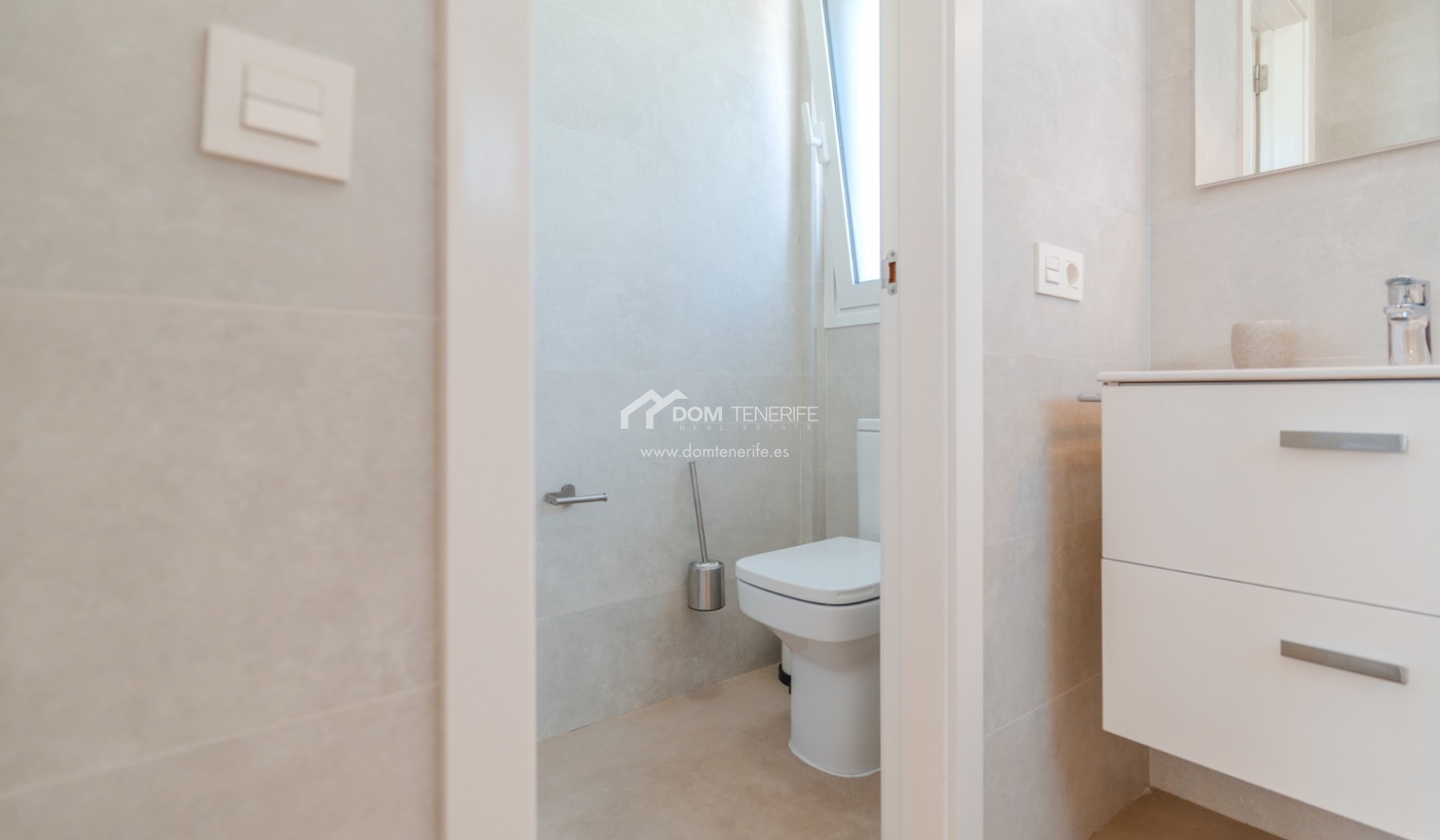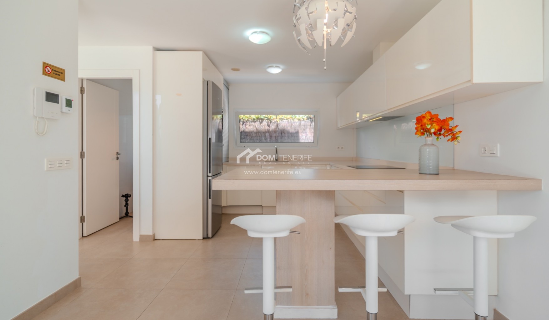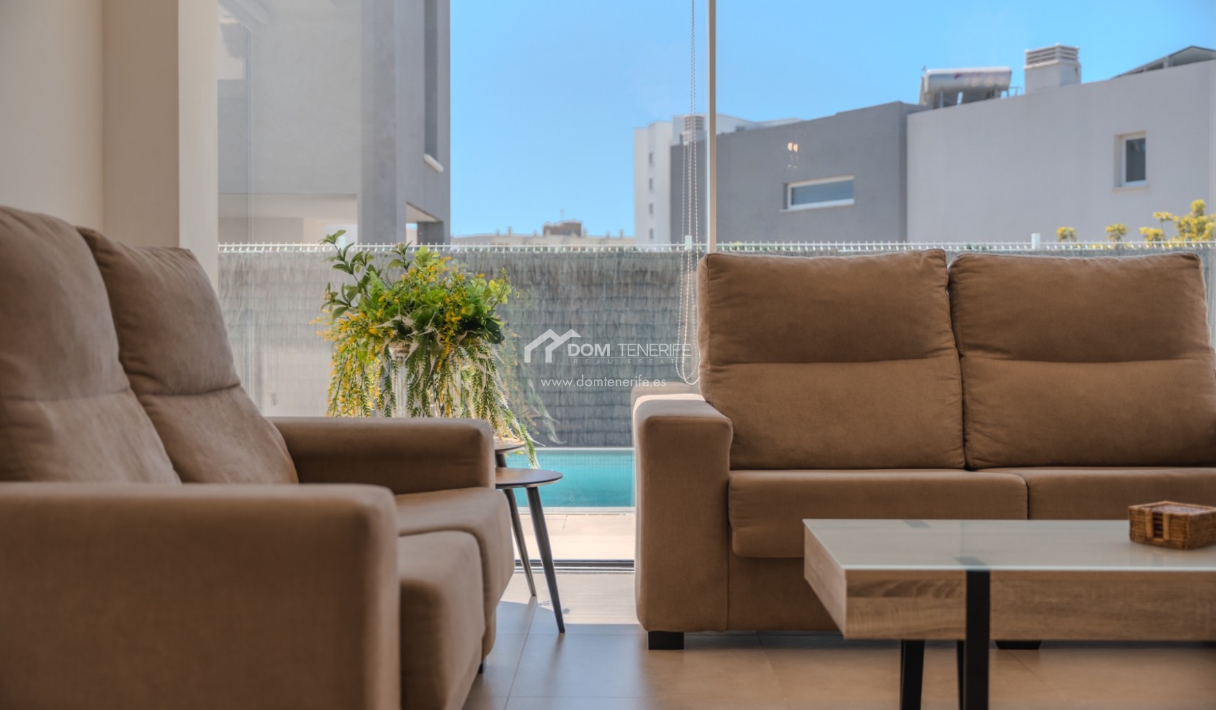 Moderne und helle Villa zum Verkauf in der privaten Wohnanlage „Nirvana Paraíso” in Playa Paraíso, erbaut auf einem Grundstück von 386,85 m² mit einer Gesamtfläche von 146,85 m² (104,22 m² nutzbar). Diese Immobilie erstreckt sich über zwei Etagen und bietet eine hervorragende Kombination aus Komfort, zeitgemäßem Design und einer privilegierten Lage im Süden Teneriffas. Im Erdgeschoss befinden sich ein geräumiges Wohn-Esszimmer, eine voll ausgestattete Küche, eine Toilette und ein Abstellraum. Im Obergeschoss befinden sich drei Schlafzimmer mit Einbauschränken, zwei Badezimmer (eines davon en suite) und zusätzlicher Stauraum. Das Hauptschlafzimmer hat Zugang zu einer privaten Terrasse mit kleinem Meerblick. Die Villa verfügt über eine Klimaanlage im gesamten Haus und Sonnenkollektoren für Warmwasser. Im Außenbereich umgeben große Terrassen den beheizten Pool und den Garten. Auf der Rückseite befindet sich ein Abstell-/Hauswirtschaftsraum, und auf der Vorderseite gibt es Platz zum Parken von mindestens zwei Fahrzeugen. Die Immobilie liegt gegenüber dem Einkaufszentrum Las Rosas, nur wenige Gehminuten von Geschäften, Restaurants und Bars entfernt und nur 10 Gehminuten vom Strand Las Galgas und dem Hard Rock Hotel Tenerife. Die Immobilie wird mit einer Ferienlizenz verkauft und ist somit eine ausgezeichnete Wahl sowohl als Hauptwohnsitz als auch als rentable Investition in einer der begehrtesten Gegenden im Süden Teneriffas. Gemeinschaftsgebühren: 41,43 €/Monat | Grundsteuer: 527,64 €/Jahr | Müllabfuhrgebühr: 34,25 €/Halbjahr. DOM Tenerife – kaufen Sie sicher!