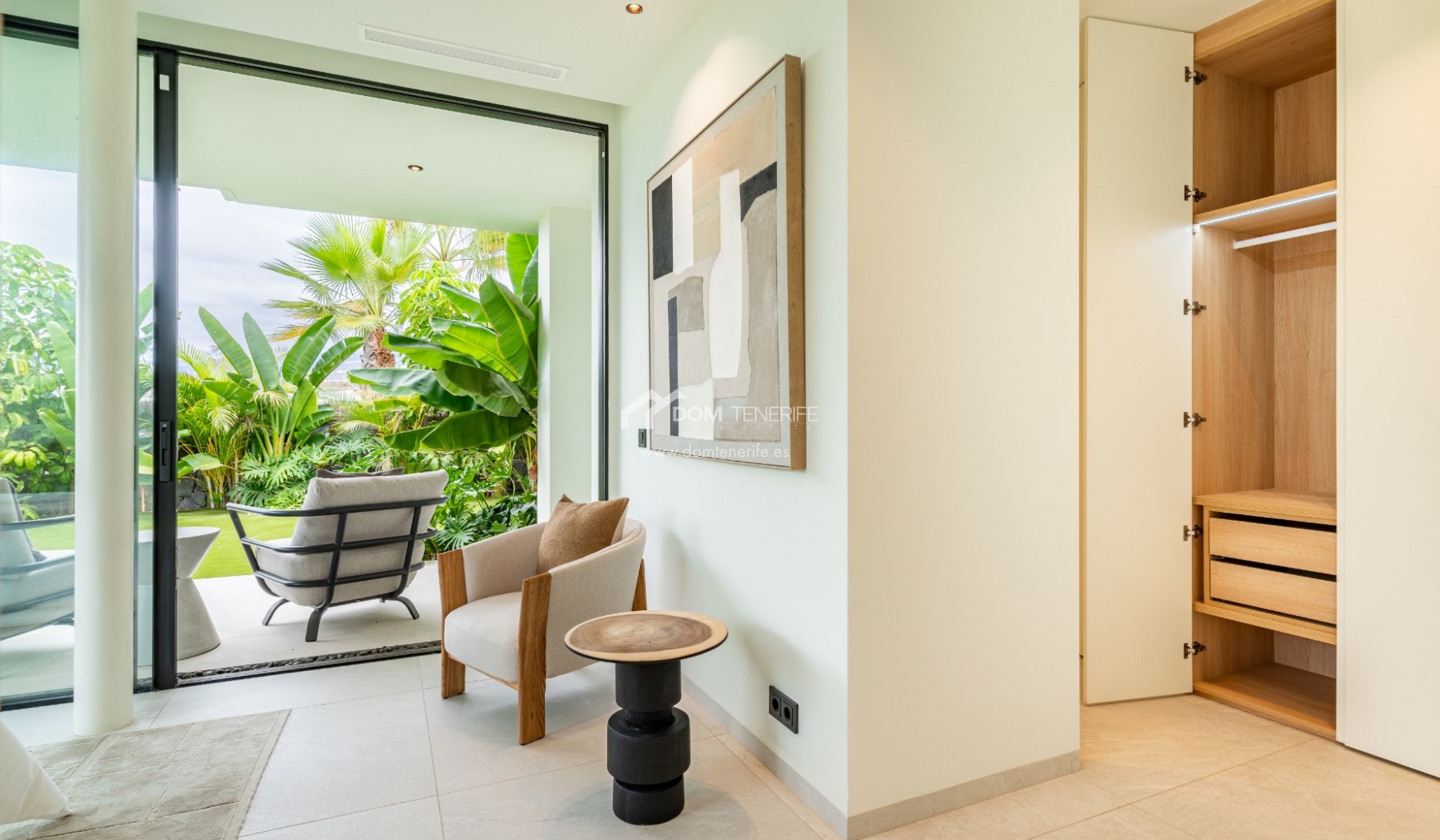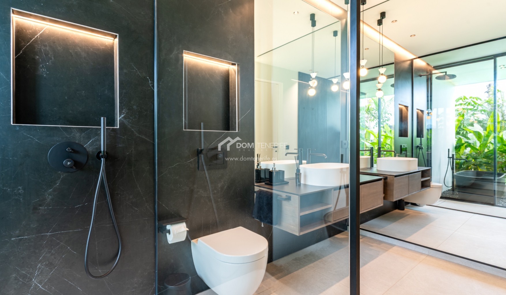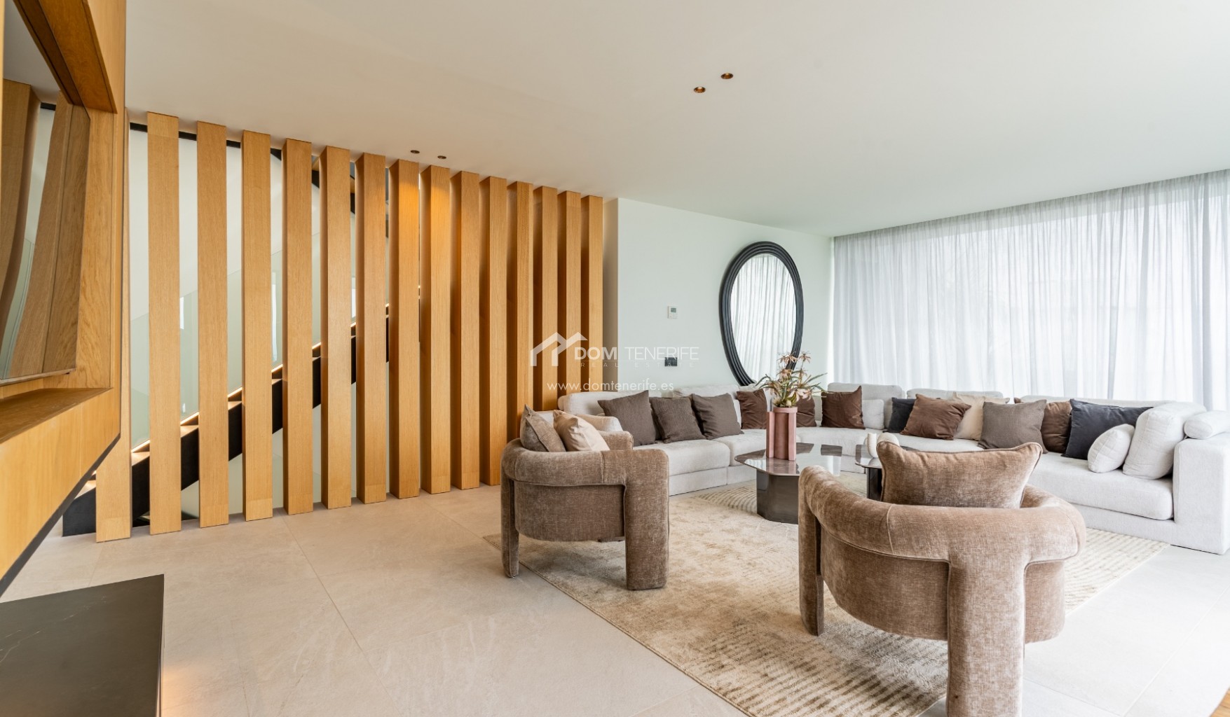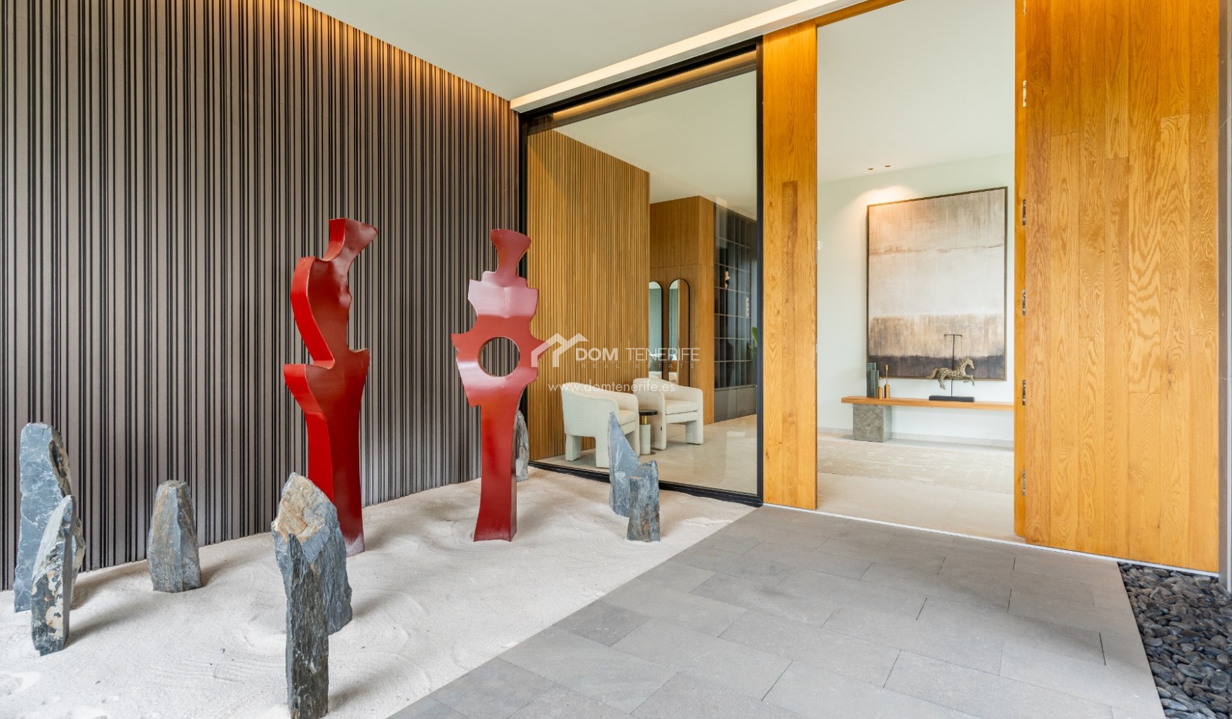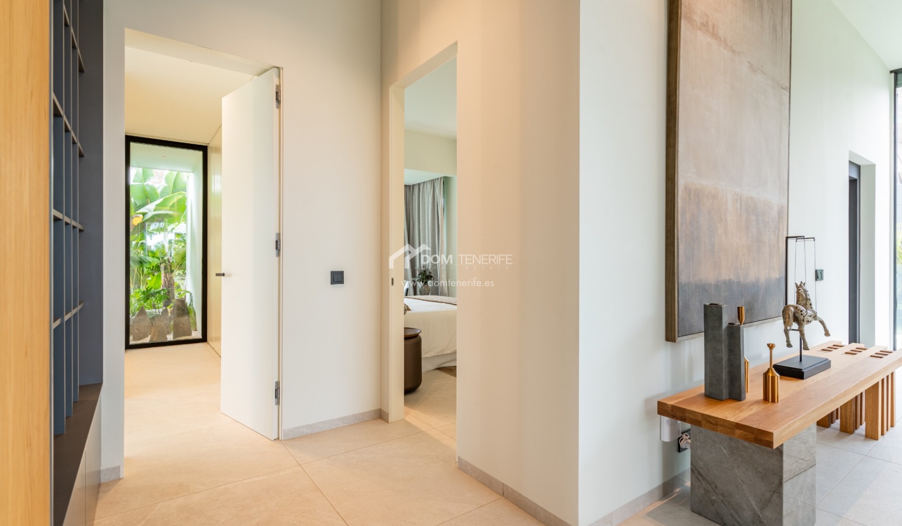 Private GaragenDiese beeindruckende Villa, entworfen vom renommierten Architekten Leonardo Omar, ist ein wahres Juwel der zeitgenössischen Architektur. Komplett fertiggestellt und elegant eingerichtet, wurde jedes Detail sorgfältig ausgewählt, um eine Atmosphäre von Luxus, Komfort und modernem Design zu schaffen. Mit einer bebauten Fläche von 430 m² auf einem Grundstück von 772 m² verfügt das Anwesen über vier geräumige Schlafzimmer, alle mit eigenem Bad, Einbauschränken und direktem Zugang zu einem üppigen tropischen Garten, der selbst ein Kunstwerk ist. Designermöbel, Dekorationsgegenstände und hochwertige Oberflächen schaffen ein harmonisches und raffiniertes Ambiente. Der Haupteingang im Erdgeschoss führt in eine elegante Eingangshalle, die mit drei Schlafzimmern mit Blick auf den Garten verbunden ist, alle mit eigenem Bad, einige davon mit Außenbadewannen, die ein einzigartiges Entspannungserlebnis bieten. Eine moderne Treppe und ein privater Aufzug führen in das Obergeschoss, wo sich das Herzstück des Hauses befindet: ein geräumiges und helles Wohnzimmer, das mit dem Esszimmer und der Designerküche mit hochwertigen Geräten verbunden ist. Hinter Glaswänden verbirgt sich ein eleganter, klimatisierter Weinkeller, perfekt für Weinliebhaber. Der Wohnbereich öffnet sich zu einer großen Terrasse mit Infinity-Pool und Panoramablick auf das Resort Abama und den Atlantik. Auf dieser Ebene ergänzt eine Außenküche mit Grill und Spüle den Raum und schafft die ideale Atmosphäre für Abendessen im Freien und unvergessliche Zusammenkünfte. Im Untergeschoss bietet die Villa eine geräumige Garage, einen Waschraum und ein zusätzliches Badezimmer. Darüber hinaus verfügt sie über ein separates, voll ausgestattetes Gästeapartment mit eigener Küche, das die Privatsphäre seiner Bewohner gewährleistet. Diese Immobilie befindet sich im renommierten Abama Resort und verbindet auf perfekte Weise Luxus, Privatsphäre und zeitgenössisches Design. Sie bietet einen exklusiven Lebensstil in einer der privilegiertesten Umgebungen im Süden Teneriffas. | Gemeinschaftsgebühren: 202 €/Quartal | Grundsteuer: 1.686 €/Jahr.