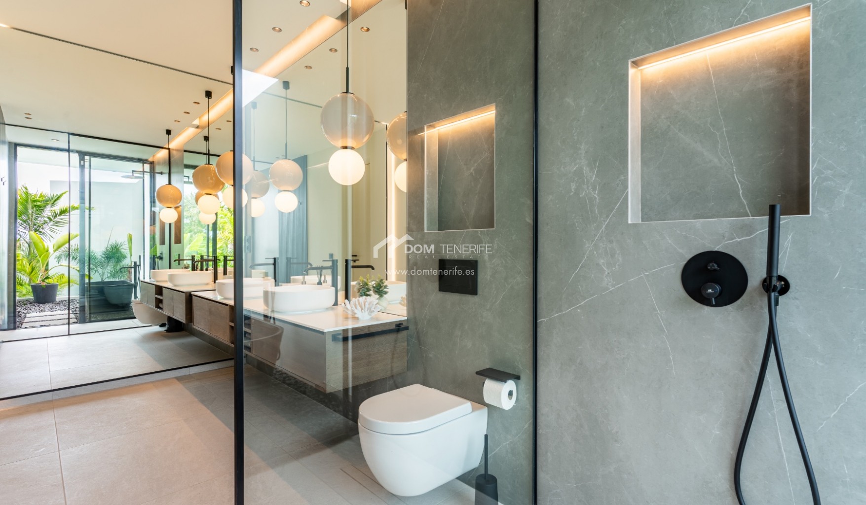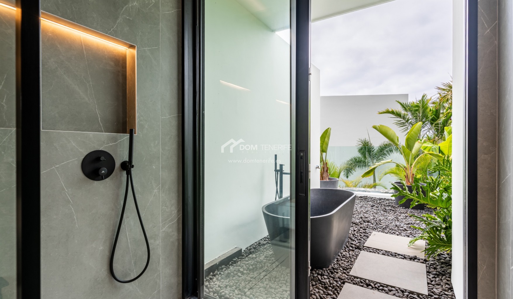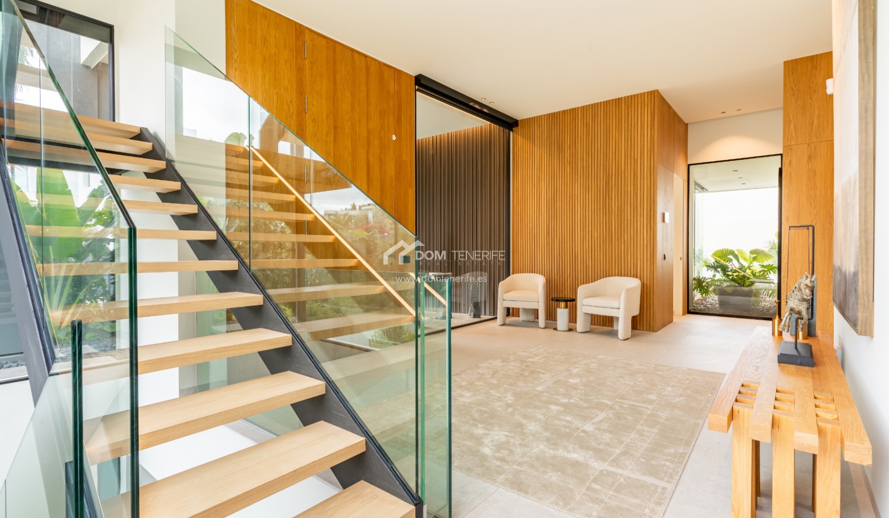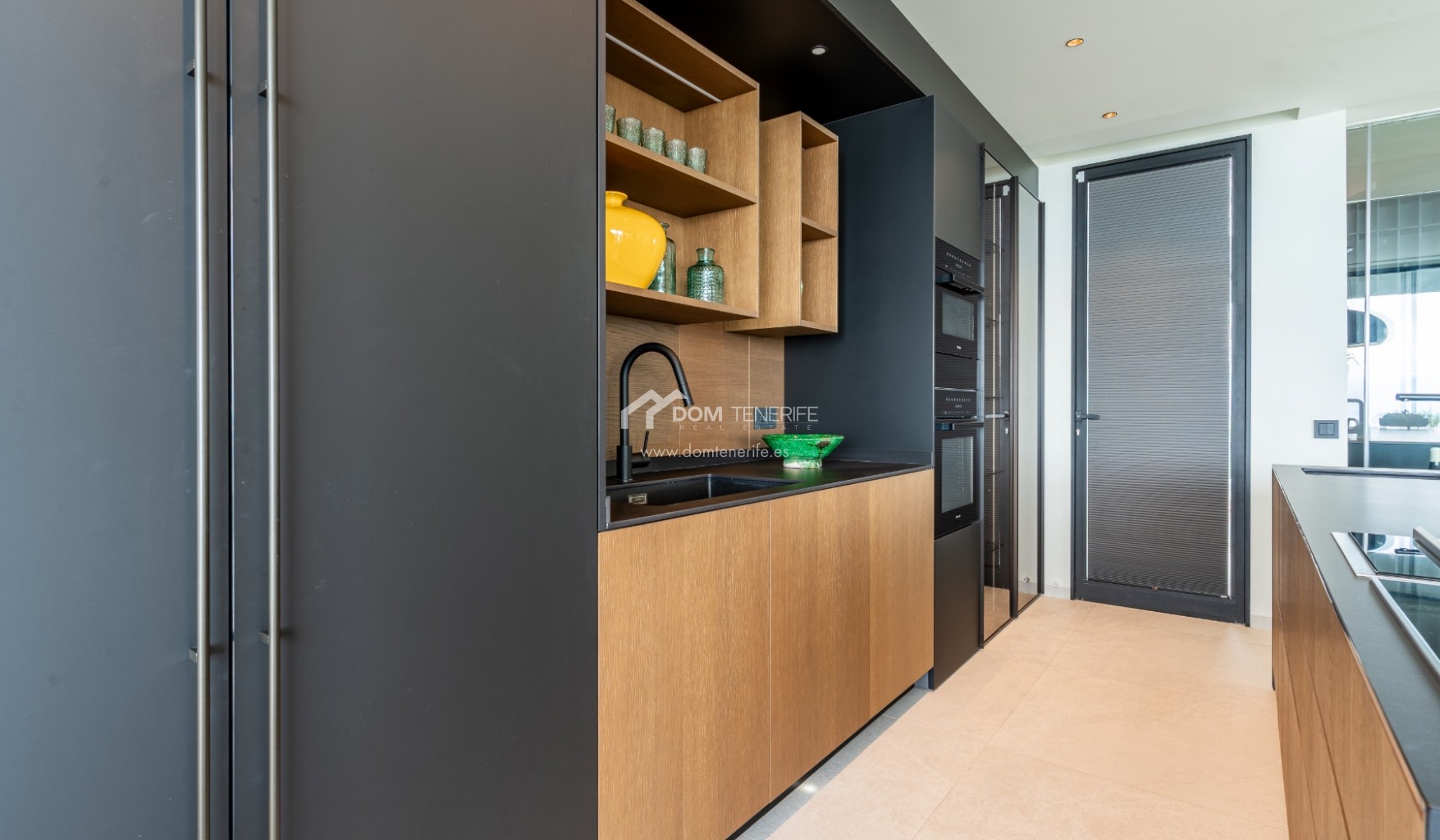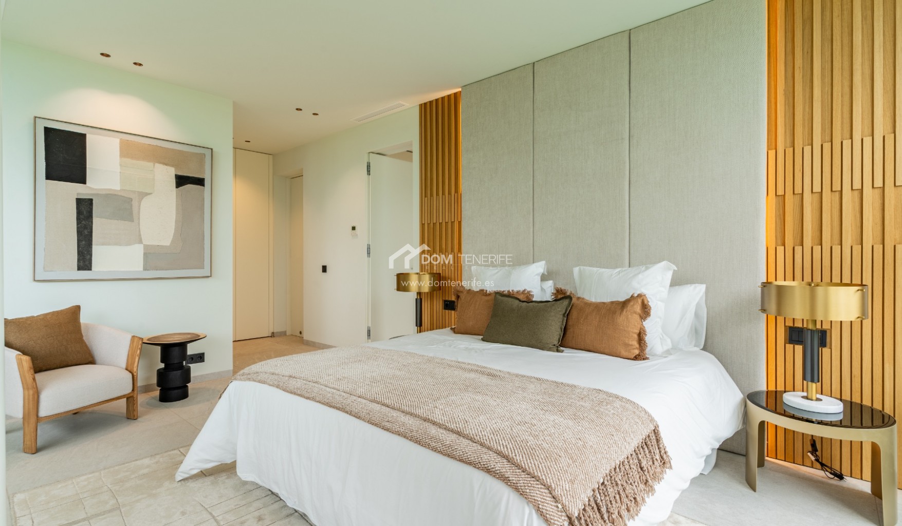 Private GaragenDiese beeindruckende Villa, entworfen vom renommierten Architekten Leonardo Omar, ist ein wahres Juwel der zeitgenössischen Architektur. Komplett fertiggestellt und elegant eingerichtet, wurde jedes Detail sorgfältig ausgewählt, um eine Atmosphäre von Luxus, Komfort und modernem Design zu schaffen. Mit einer bebauten Fläche von 430 m² auf einem Grundstück von 772 m² verfügt das Anwesen über vier geräumige Schlafzimmer, alle mit eigenem Bad, Einbauschränken und direktem Zugang zu einem üppigen tropischen Garten, der selbst ein Kunstwerk ist. Designermöbel, Dekorationsgegenstände und hochwertige Oberflächen schaffen ein harmonisches und raffiniertes Ambiente. Der Haupteingang im Erdgeschoss führt in eine elegante Eingangshalle, die mit drei Schlafzimmern mit Blick auf den Garten verbunden ist, alle mit eigenem Bad, einige davon mit Außenbadewannen, die ein einzigartiges Entspannungserlebnis bieten. Eine moderne Treppe und ein privater Aufzug führen in das Obergeschoss, wo sich das Herzstück des Hauses befindet: ein geräumiges und helles Wohnzimmer, das mit dem Esszimmer und der Designerküche mit hochwertigen Geräten verbunden ist. Hinter Glaswänden verbirgt sich ein eleganter, klimatisierter Weinkeller, perfekt für Weinliebhaber. Der Wohnbereich öffnet sich zu einer großen Terrasse mit Infinity-Pool und Panoramablick auf das Resort Abama und den Atlantik. Auf dieser Ebene ergänzt eine Außenküche mit Grill und Spüle den Raum und schafft die ideale Atmosphäre für Abendessen im Freien und unvergessliche Zusammenkünfte. Im Untergeschoss bietet die Villa eine geräumige Garage, einen Waschraum und ein zusätzliches Badezimmer. Darüber hinaus verfügt sie über ein separates, voll ausgestattetes Gästeapartment mit eigener Küche, das die Privatsphäre seiner Bewohner gewährleistet. Diese Immobilie befindet sich im renommierten Abama Resort und verbindet auf perfekte Weise Luxus, Privatsphäre und zeitgenössisches Design. Sie bietet einen exklusiven Lebensstil in einer der privilegiertesten Umgebungen im Süden Teneriffas. | Gemeinschaftsgebühren: 202 €/Quartal | Grundsteuer: 1.686 €/Jahr.