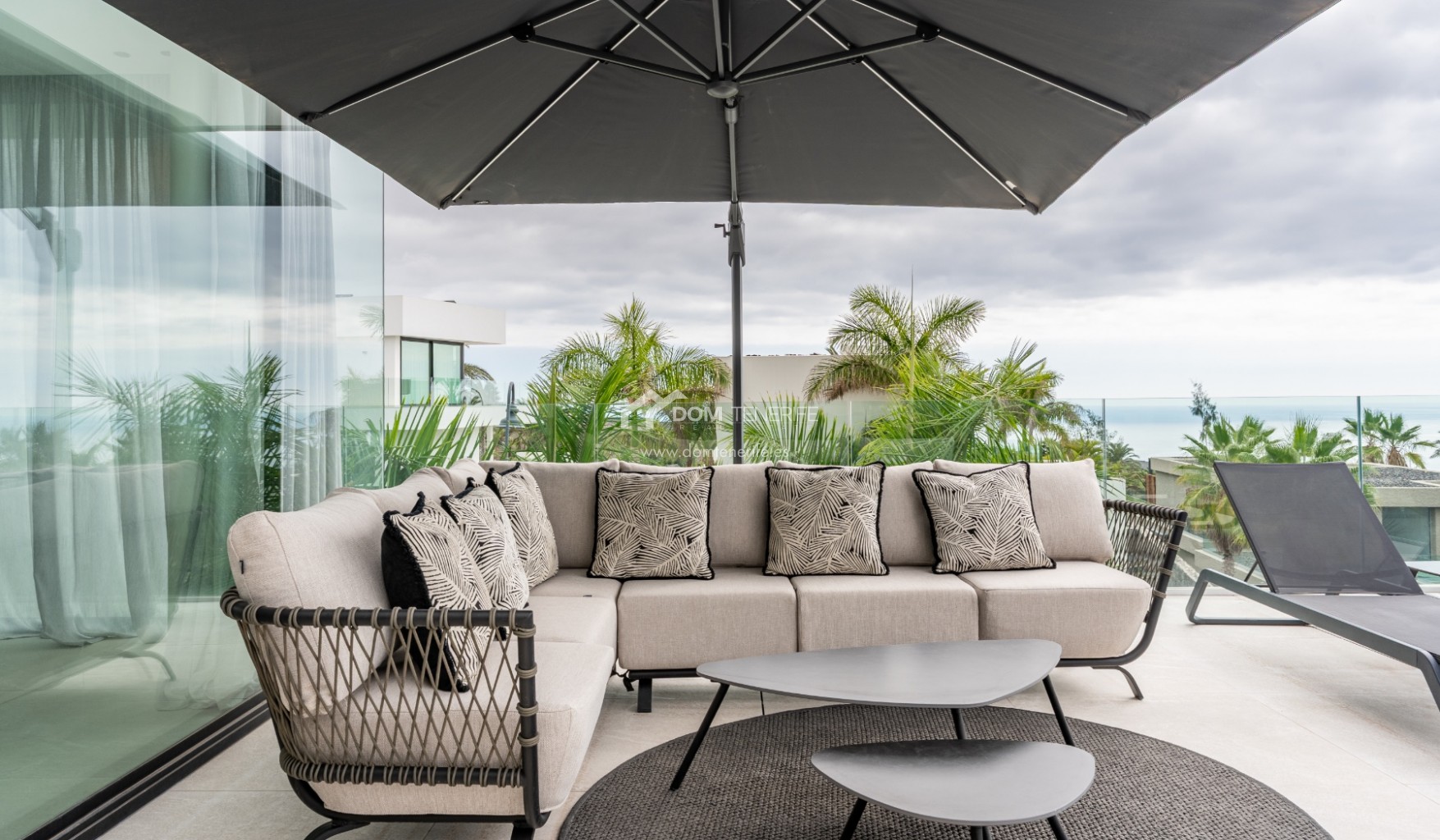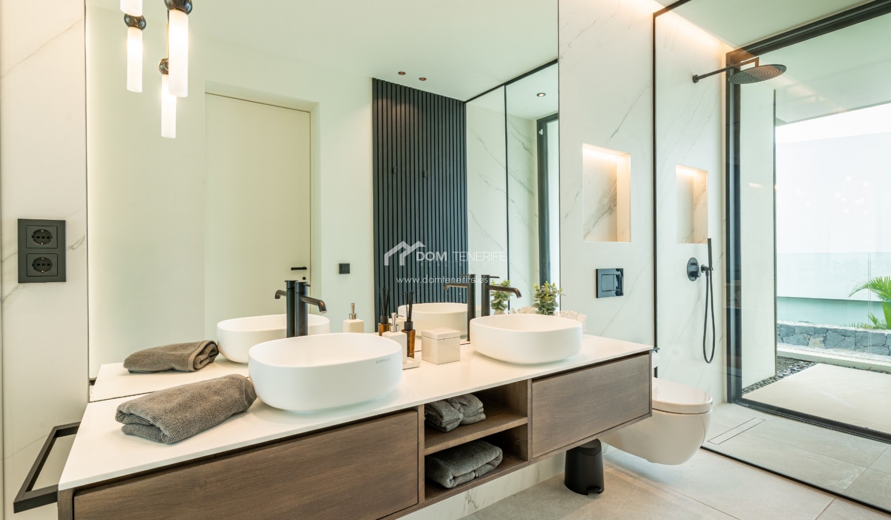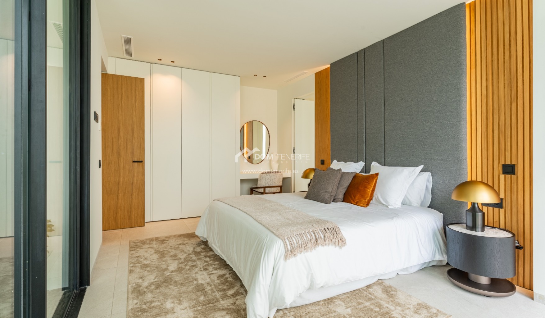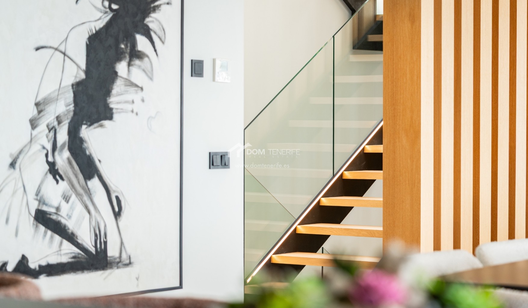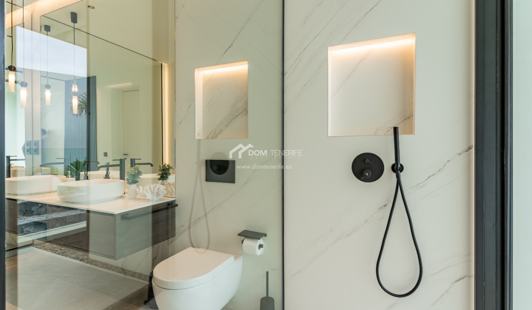 Private GaragenDiese beeindruckende Villa, entworfen vom renommierten Architekten Leonardo Omar, ist ein wahres Juwel der zeitgenössischen Architektur. Komplett fertiggestellt und elegant eingerichtet, wurde jedes Detail sorgfältig ausgewählt, um eine Atmosphäre von Luxus, Komfort und modernem Design zu schaffen. Mit einer bebauten Fläche von 430 m² auf einem Grundstück von 772 m² verfügt das Anwesen über vier geräumige Schlafzimmer, alle mit eigenem Bad, Einbauschränken und direktem Zugang zu einem üppigen tropischen Garten, der selbst ein Kunstwerk ist. Designermöbel, Dekorationsgegenstände und hochwertige Oberflächen schaffen ein harmonisches und raffiniertes Ambiente. Der Haupteingang im Erdgeschoss führt in eine elegante Eingangshalle, die mit drei Schlafzimmern mit Blick auf den Garten verbunden ist, alle mit eigenem Bad, einige davon mit Außenbadewannen, die ein einzigartiges Entspannungserlebnis bieten. Eine moderne Treppe und ein privater Aufzug führen in das Obergeschoss, wo sich das Herzstück des Hauses befindet: ein geräumiges und helles Wohnzimmer, das mit dem Esszimmer und der Designerküche mit hochwertigen Geräten verbunden ist. Hinter Glaswänden verbirgt sich ein eleganter, klimatisierter Weinkeller, perfekt für Weinliebhaber. Der Wohnbereich öffnet sich zu einer großen Terrasse mit Infinity-Pool und Panoramablick auf das Resort Abama und den Atlantik. Auf dieser Ebene ergänzt eine Außenküche mit Grill und Spüle den Raum und schafft die ideale Atmosphäre für Abendessen im Freien und unvergessliche Zusammenkünfte. Im Untergeschoss bietet die Villa eine geräumige Garage, einen Waschraum und ein zusätzliches Badezimmer. Darüber hinaus verfügt sie über ein separates, voll ausgestattetes Gästeapartment mit eigener Küche, das die Privatsphäre seiner Bewohner gewährleistet. Diese Immobilie befindet sich im renommierten Abama Resort und verbindet auf perfekte Weise Luxus, Privatsphäre und zeitgenössisches Design. Sie bietet einen exklusiven Lebensstil in einer der privilegiertesten Umgebungen im Süden Teneriffas. | Gemeinschaftsgebühren: 202 €/Quartal | Grundsteuer: 1.686 €/Jahr.
