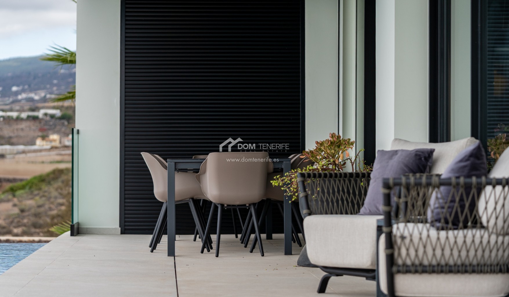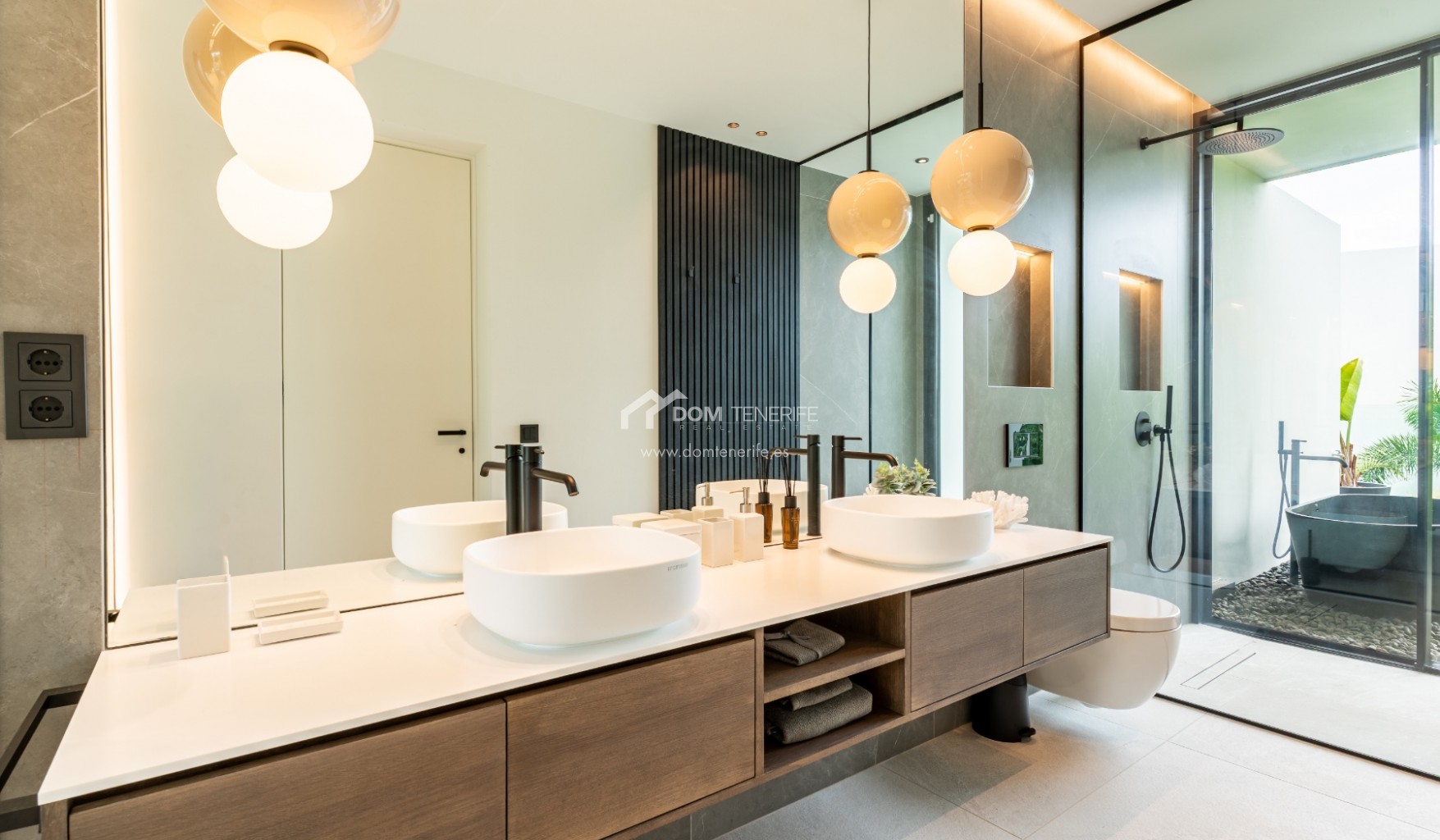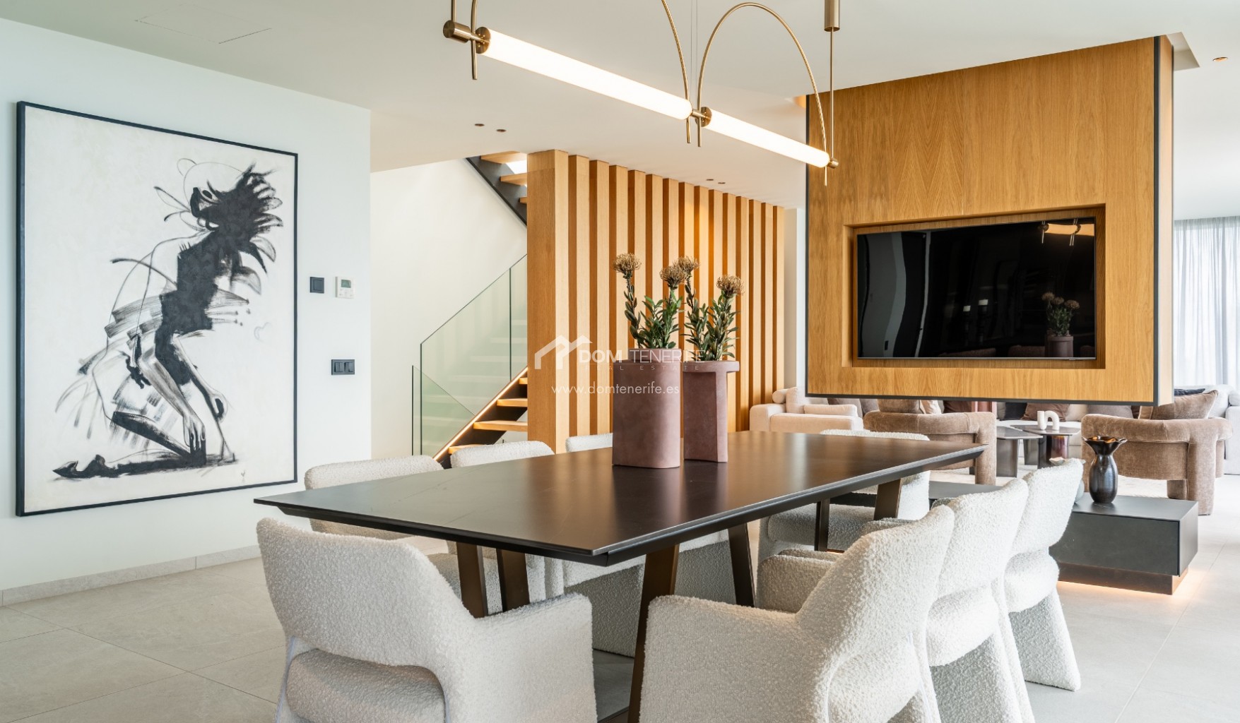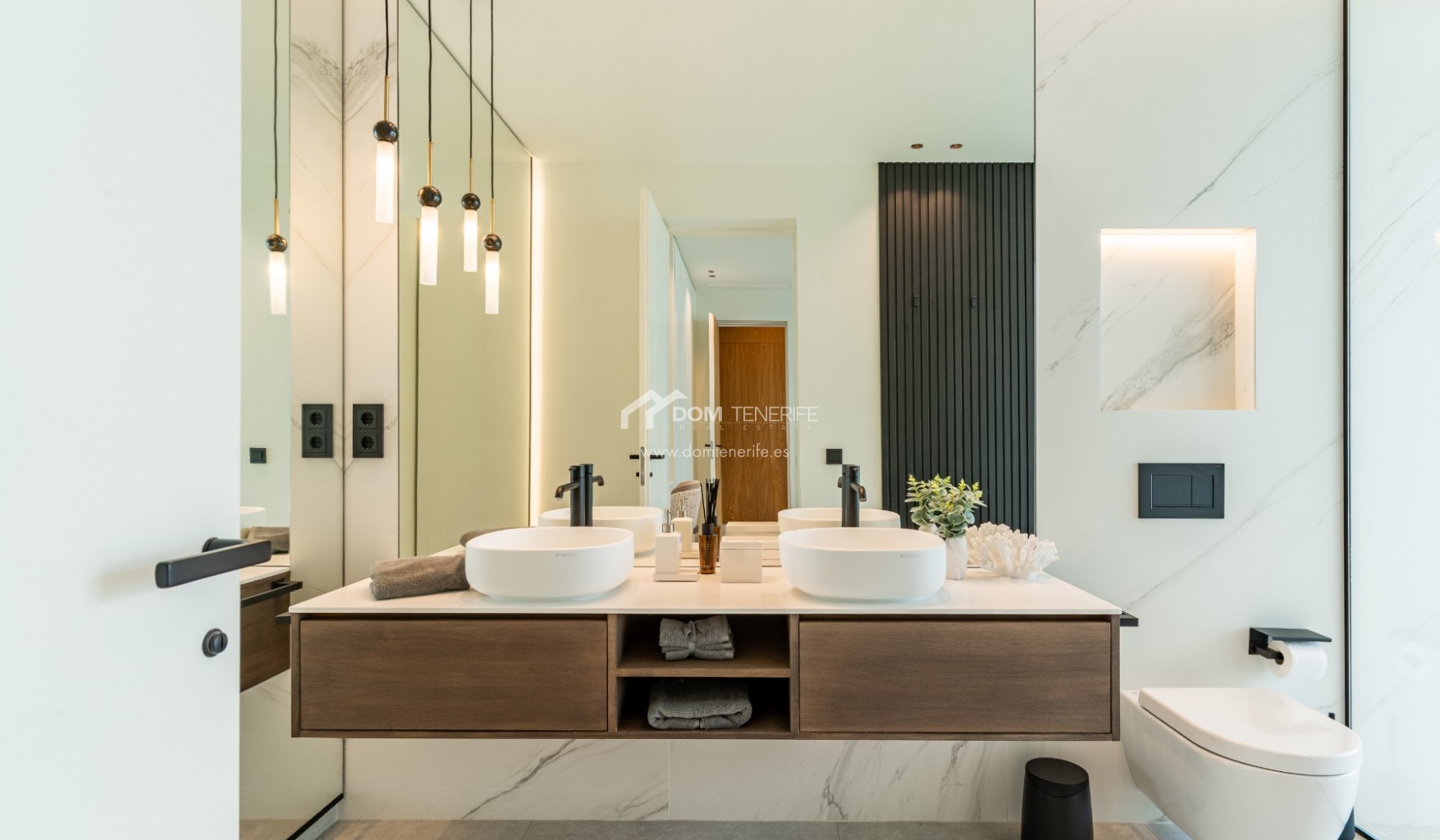 Private GaragenDiese beeindruckende Villa, entworfen vom renommierten Architekten Leonardo Omar, ist ein wahres Juwel der zeitgenössischen Architektur. Komplett fertiggestellt und elegant eingerichtet, wurde jedes Detail sorgfältig ausgewählt, um eine Atmosphäre von Luxus, Komfort und modernem Design zu schaffen. Mit einer bebauten Fläche von 430 m² auf einem Grundstück von 772 m² verfügt das Anwesen über vier geräumige Schlafzimmer, alle mit eigenem Bad, Einbauschränken und direktem Zugang zu einem üppigen tropischen Garten, der selbst ein Kunstwerk ist. Designermöbel, Dekorationsgegenstände und hochwertige Oberflächen schaffen ein harmonisches und raffiniertes Ambiente. Der Haupteingang im Erdgeschoss führt in eine elegante Eingangshalle, die mit drei Schlafzimmern mit Blick auf den Garten verbunden ist, alle mit eigenem Bad, einige davon mit Außenbadewannen, die ein einzigartiges Entspannungserlebnis bieten. Eine moderne Treppe und ein privater Aufzug führen in das Obergeschoss, wo sich das Herzstück des Hauses befindet: ein geräumiges und helles Wohnzimmer, das mit dem Esszimmer und der Designerküche mit hochwertigen Geräten verbunden ist. Hinter Glaswänden verbirgt sich ein eleganter, klimatisierter Weinkeller, perfekt für Weinliebhaber. Der Wohnbereich öffnet sich zu einer großen Terrasse mit Infinity-Pool und Panoramablick auf das Resort Abama und den Atlantik. Auf dieser Ebene ergänzt eine Außenküche mit Grill und Spüle den Raum und schafft die ideale Atmosphäre für Abendessen im Freien und unvergessliche Zusammenkünfte. Im Untergeschoss bietet die Villa eine geräumige Garage, einen Waschraum und ein zusätzliches Badezimmer. Darüber hinaus verfügt sie über ein separates, voll ausgestattetes Gästeapartment mit eigener Küche, das die Privatsphäre seiner Bewohner gewährleistet. Diese Immobilie befindet sich im renommierten Abama Resort und verbindet auf perfekte Weise Luxus, Privatsphäre und zeitgenössisches Design. Sie bietet einen exklusiven Lebensstil in einer der privilegiertesten Umgebungen im Süden Teneriffas. | Gemeinschaftsgebühren: 202 €/Quartal | Grundsteuer: 1.686 €/Jahr.