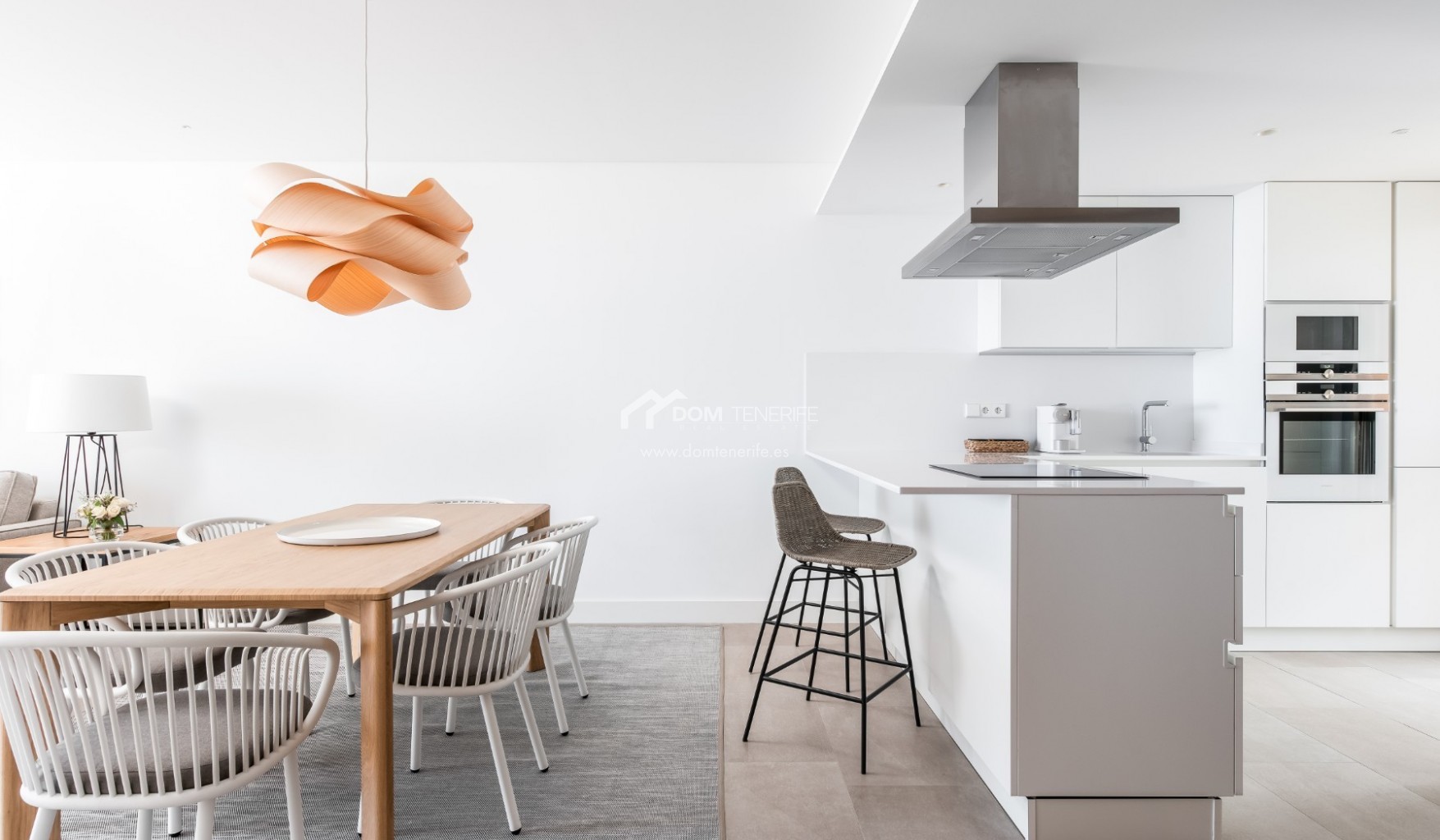 L’intérieur présente un design élégant et équilibré, avec deux chambres spacieuses, placards intégrés et mobilier de haute qualité. La chambre principale dispose d’un accès direct à la terrasse par des baies vitrées coulissantes du sol au plafond, renforçant la connexion entre les espaces intérieurs et extérieurs. Les salles de bains sont réalisées avec des matériaux haut de gamme, reflétant le standard d’une propriété de luxe dans le sud de Tenerife.